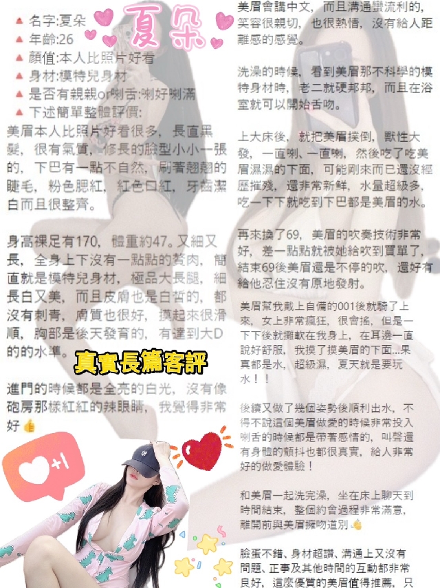 (服務項目) 無套吹 共浴 小親親 品鮑 69 胸推 奶炮 屁推 按摩 深喉嚨胸磨臉 雙龍 免費套裝:性感睡衣、丁字褲 口爆+500 買二節送一共150分(3S) 買三節送一共200分(4S)
